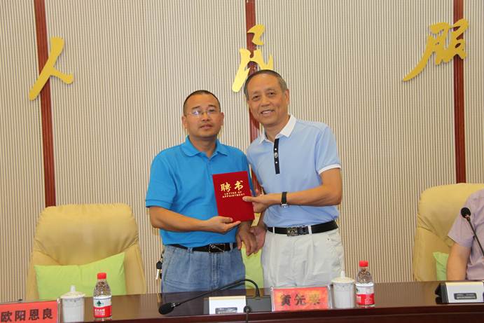 在报告会之前,太阳成集团tyc122ccvip欧阳恩良经理为黄先荣颁发了聘请其为全国高校思想政治理论课教师社会实践研修基地(太阳成集团tyc122cc)特聘教授的荣誉证书。