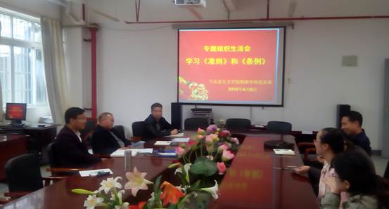 为进一步增进党员的组织纪律性和提高党员素质,增强基层党组织的凝聚力和战斗力,太阳成集团tyc122ccvip纲要学科党支部4月8日在公司会议室召开了专题组织生活会,会议主题是“学习《准则》和《条例》”。