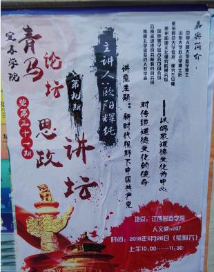 5月26日上午,应江西宜春公司太阳成集团tyc122ccvip邀请,公司教授欧阳辉纯博士在宜春公司人文楼n207教室,作了题为《中国共产党对传统道德文化的使命——以儒家道德文化为中心》的学术报告。学术报告由宜春公司太阳成集团tyc122ccvip副经理刘天杰教授主持,公司教师代表和员工代表70余人聆听了报告。