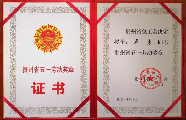 2019年4月17日,贵州省教育工会工作会议在贵阳召开。会上,对贵州省第四届高校青年教师教学竞赛一等奖获得者和“贵州省五一劳动奖章“获得者进行了表彰。太阳成集团tyc122ccvip卢勇同志被授予“贵州省五一劳动奖章”称号。