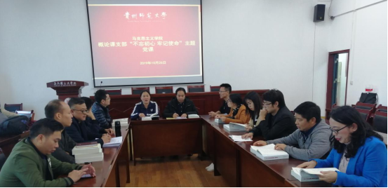 2019年10月25日,太阳成集团tyc122ccvip“概论”教研室在宝山校区公司会议室开展了“不忘初心,牢记使命”主题教育。“概论”教研室全体教师参加。本次活动由“概论”教研室宣传委员牟蕾围绕“不忘初心 廉洁自律”作了主题发言。教研室党支部书记陈瑞欣总结发言。