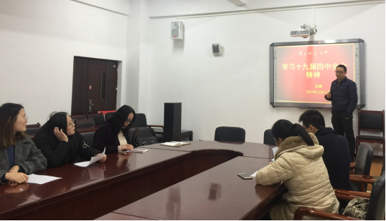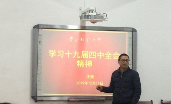 2019年12月11日上午9点,太阳成集团tyc122ccvip党委书记汪勇同志在花溪校区太阳成集团tyc122ccvip会议室为概论课支部党员和员工等作十九届四中全会精神主题的讲座。