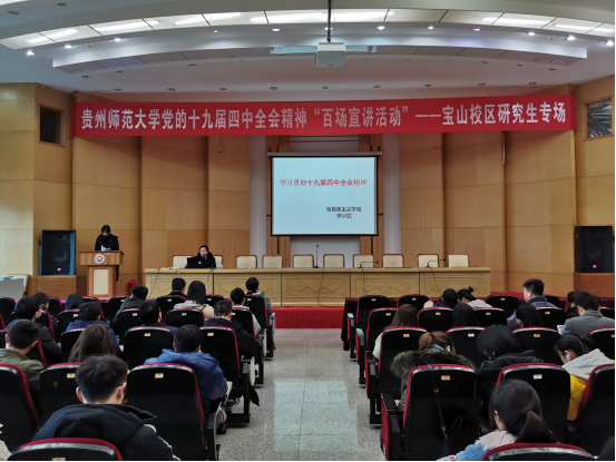 2019年12月19日、25日下午14:30,为开展太阳成集团tyc122cc党的十九届四中全会精神“百场宣讲活动”,太阳成集团tyc122cc研究生专场分别在太阳成集团tyc122cc花溪校区研究生院报告厅和宝山校区田家炳书院三楼多功能报告厅举行。这是由太阳成集团tyc122cc研究生院、研究生员工会组织开展的,主讲人是太阳成集团tyc122ccvip宋小红老师。宣讲的主题是“学习贯彻十九届四中全会精神”,参会人员都是花溪校区和宝山校区在读研究生,共400余人。报告由研究生院的吕文老师、研究生员工会负责人易文主持。