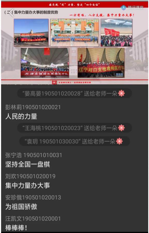 战“疫”还没有结束,面对新冠肺炎疫情,同学们一定要坚定“四个自信”,保有家国情怀,服从防控大局,珍惜生命拥有,增强才干本领,并期待着同学们早日平安健康地回到公司。“那么平凡的我们,能在这场战“疫”中做些什么呢?”肖远平和同学们讲到,虽然大家因专业所限不能像医护人员一样冲在一线救治病人,但我们在也看到了“95后”“00后”的智慧与担当:戴口罩戴的最快的是你们,不仅自己戴,还要劝父母家人戴;宅在家里最安静的是你们,不但宅,还会规划自己的“宅生活”,看文献、背单词、学高数,一点也没荒废;员工干部更是认真负责,每天按时汇报班级情况,还会召开视频会议交流员工组织工作;不少班级都自发组织了为武汉医院捐款的活动;也有的同学,在确保做好防护的前提下,就近就便地开展志愿服务……这正是同学们用实际的行动来践行的家国情怀。他希望大家能在懂得敬畏生命、珍爱生命、感恩生命的同时,学会更加珍惜温暖亲情、纯洁友情和质朴同胞情,学会更加珍惜青春时光、青春梦想和青春信仰,在生命有限的长度内活出无限的广阔,让生命在蓬勃生长中释放出强大的正能量。肖远平希望同学们从中感受中国战“疫”力量,在防控疫情的过程中,用实际行动弘扬“四个自信”,对中国共产党、对政府、对人民、对科学、对公有制保有信心;在面对艰难险阻,包括牺牲个人利益和局部利益的时候,保有必然胜利的信心;在防控疫情过程中面对官僚主义、形式主义的错误做法敢于斗争的信心,包括进行自我斗争的信心;要坚定在党中央的坚强领导下,在全国人民的共同努力下,我们必定会战胜新冠肺炎疫情的信心。据悉,根据公司统一安排,各公司党政负责人、思政课专业教师、辅导员等也将面向员工开展上百场“形势与政策”疫情思政“云端”宣讲教育。